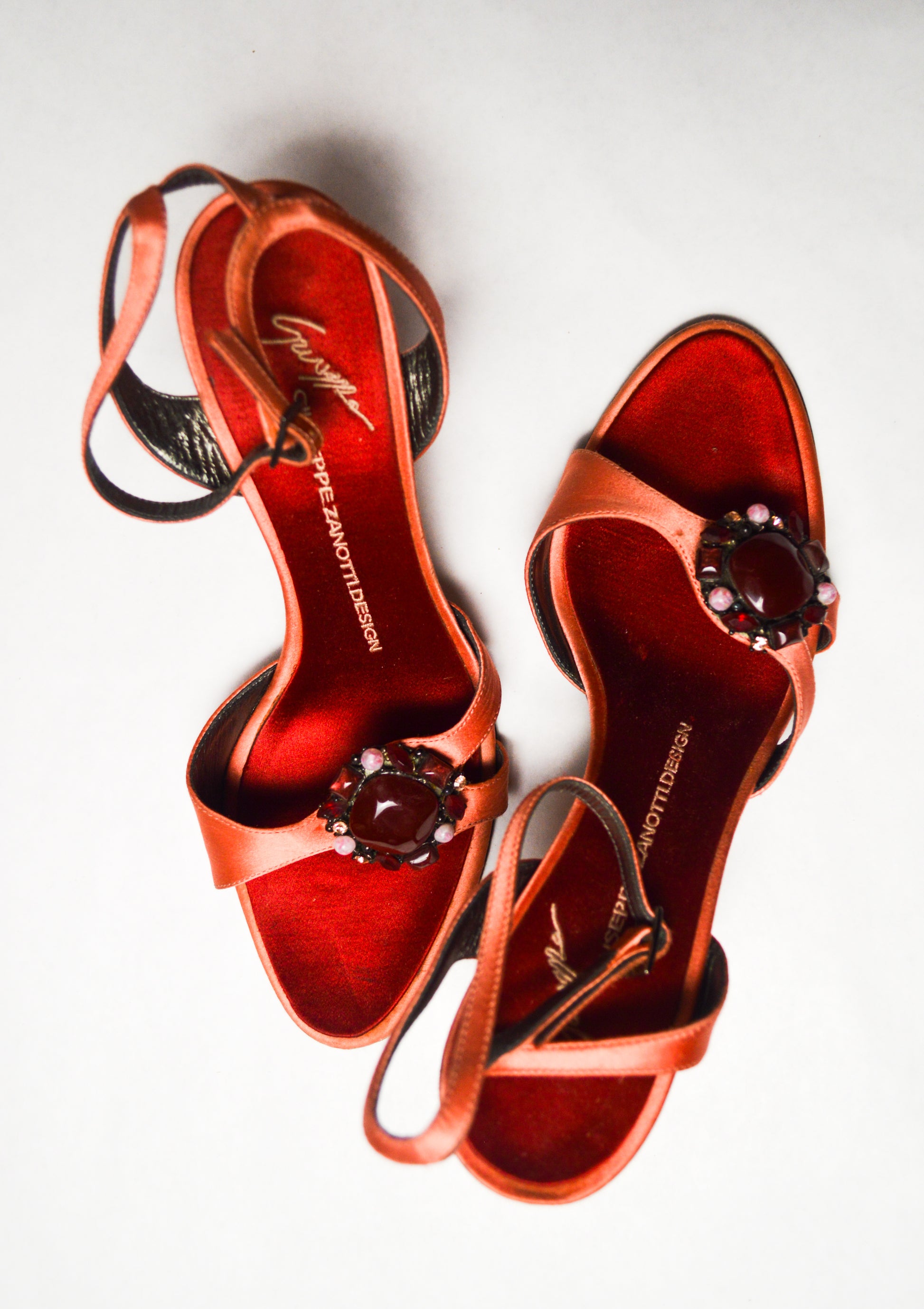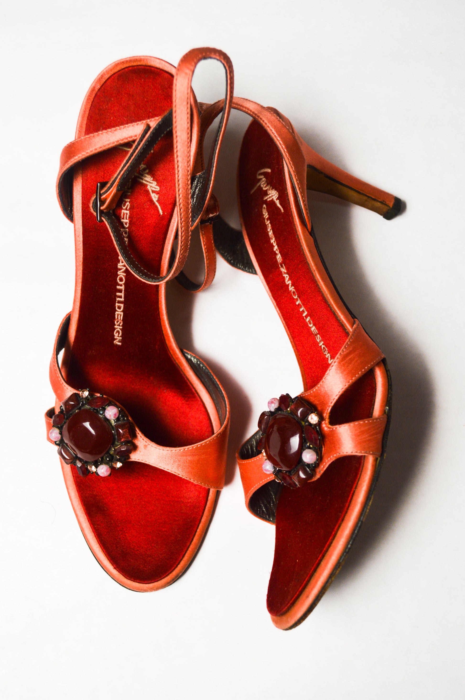 This pair of fuchsia satin sandals with an ankle strap and jeweled embellishments is a cute yet flirty addition to one’s wardrobe. The eye catching circular jewels are intermingled and bounce off the light to create a deep purple bejeweled look.